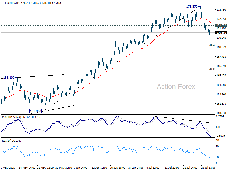 Intraday bias in EUR/JPY stays on the downside at this point. Fall from 173.87, as a correction to rally form 161.06, is in progress for 38.2% retracement of 161.06 to 173.87 at 168.97. Strong support should emerge from 55 D EMA (now at 168.68) to contain downside and bring rebound. On the upside, above 171.52 minor resistance will turn intraday bias neutral first.