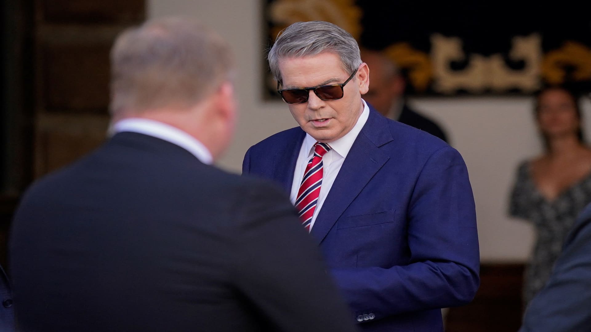 U.S. Treasury Secretary Scott Bessent arrives to meet Spain’s Foreign Minister Jose Manuel Albares, to continue discussions on trade, economic and national security issues, in Madrid on Sept. 14, 2025.