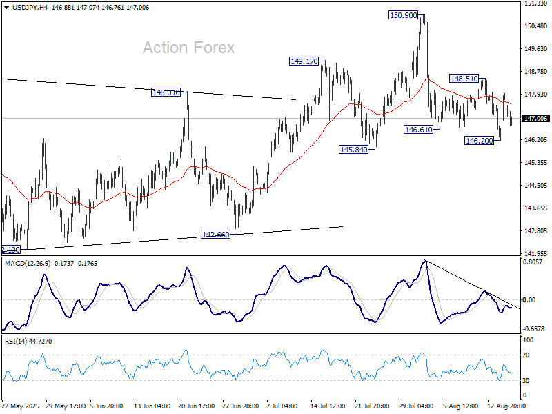 Intraday bias in USD/JPY stays neutral at this point and outlook is unchanged. Further decline is mildly in favor as long as 148.51 resistance holds. On the downside, firm break of 146.85 support will suggest that whole rebound from 139.87 has completed at 150.90, and turn outlook bearish. Next target is 142.66 support. On the upside, above 148.51 will bring retest of 150.90 instead.